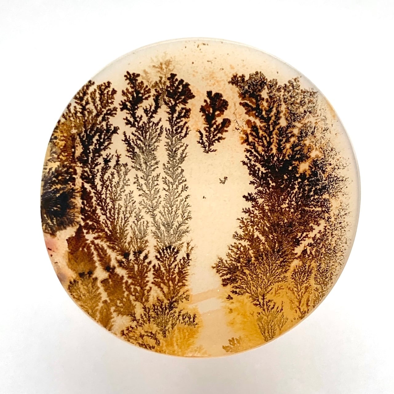 メノウの塊にできた亀裂の中に二酸化マンガンなどの金属イオンが、まるで植物のように結晶していく自然のアートを閉じ込めたかのような石です。