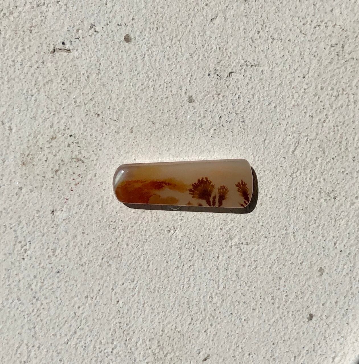 メノウの塊にできた亀裂の中に二酸化マンガンなどの金属イオンが、まるで植物のように結晶していく自然のアートを閉じ込めたかのような石です。