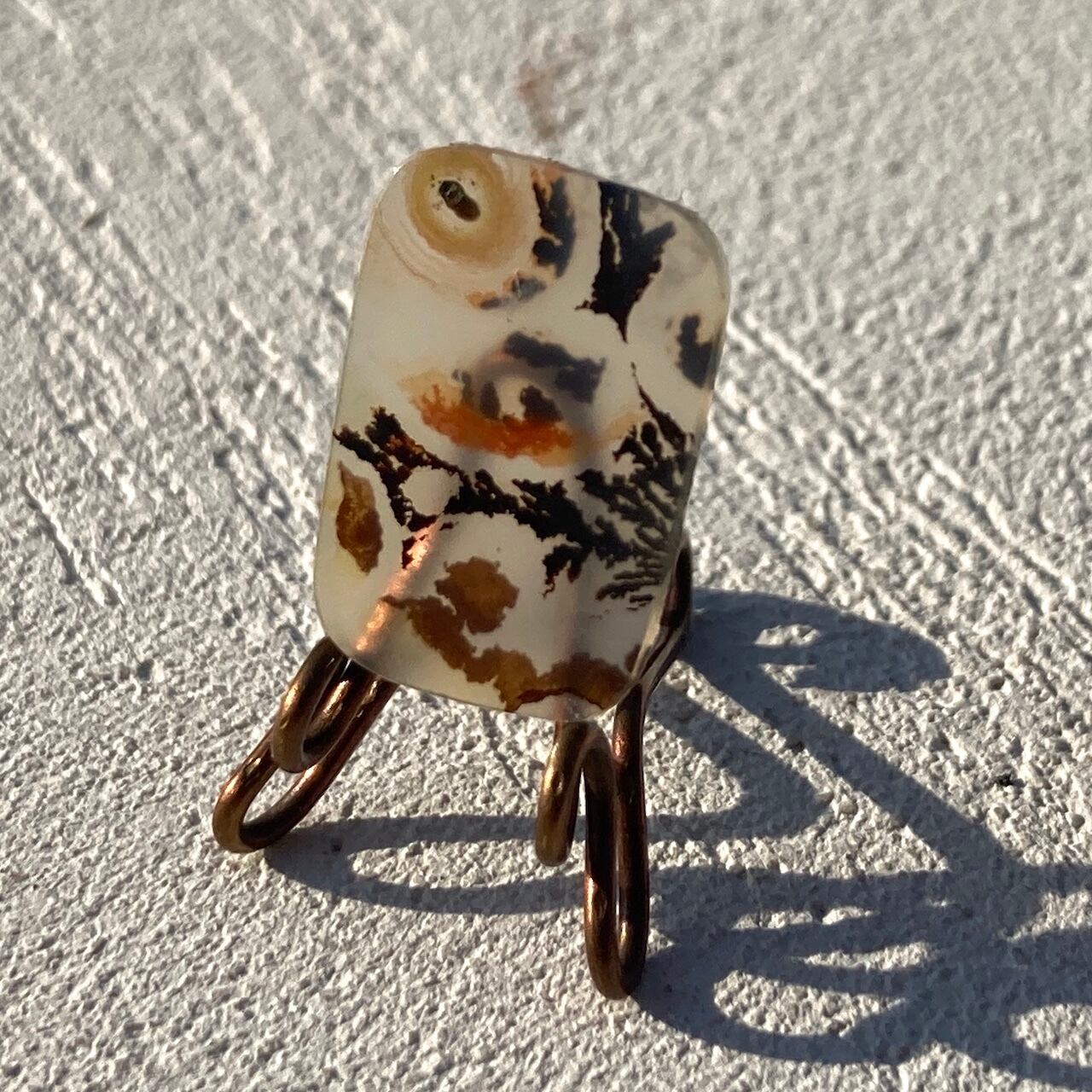メノウの塊にできた亀裂の中に二酸化マンガンなどの金属イオンが、まるで植物のように結晶していく自然のアートを閉じ込めたかのような石です。