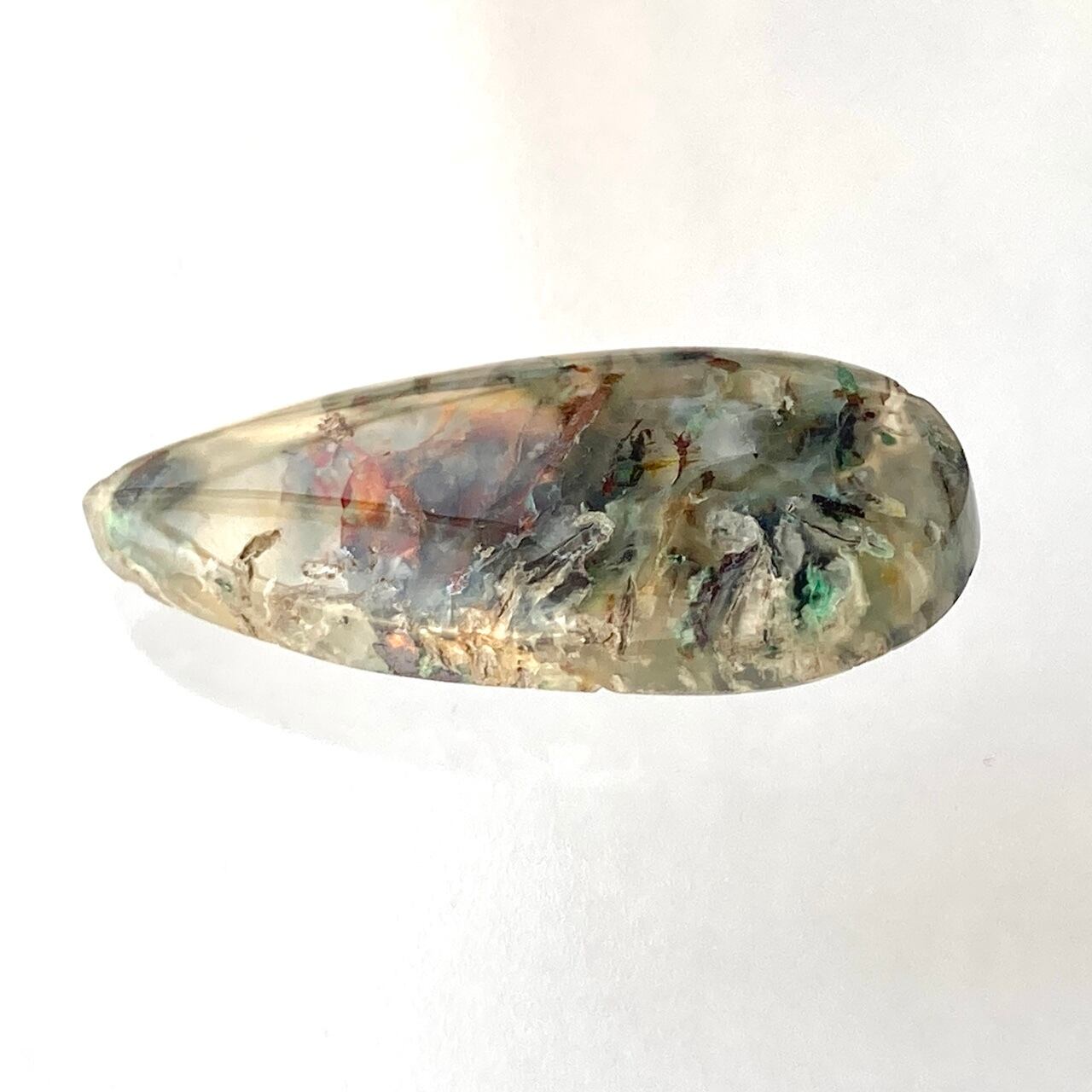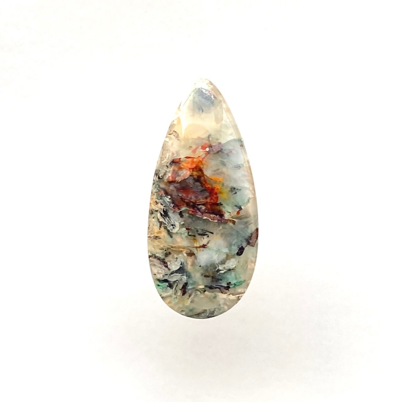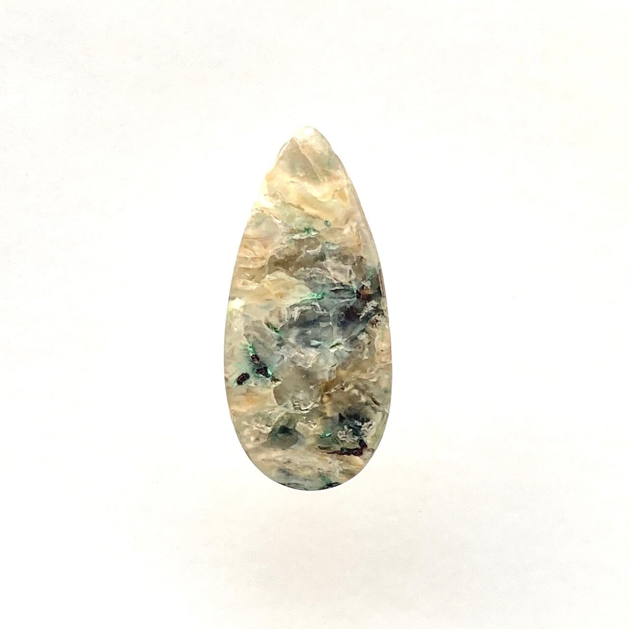 乳白色の柔らかい色をベースにふわふわと青や緑が舞う、不思議で少し可愛らしい世界観を持つこの石を、scenicaが縁の深いインドネシアからご紹介します。
